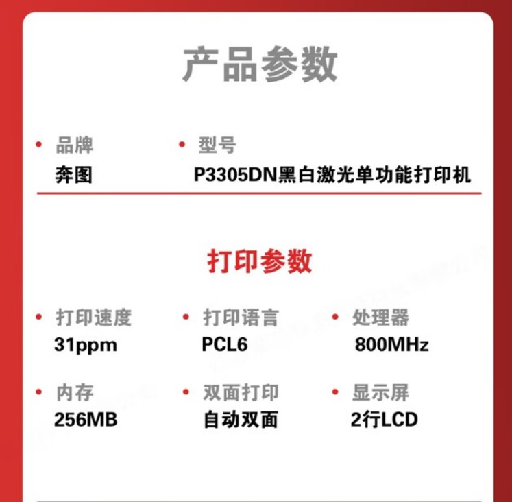當(dāng)前位置: 首頁 > 打印設(shè)備 > 激光打印機(jī) > 奔圖P3305DN 黑白激光經(jīng)濟(jì)型單功能全國產(chǎn)化打印機(jī) 速度31頁/分鐘 有線網(wǎng)絡(luò) 雙面 支持國產(chǎn)系統(tǒng)